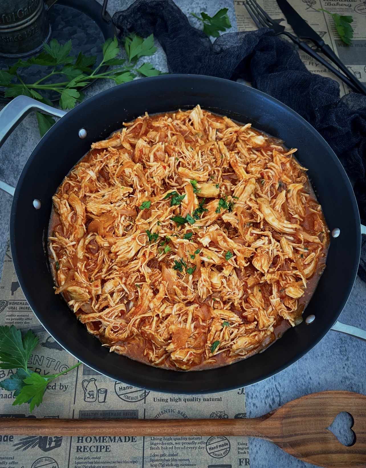 - Dann lässt du das Pulled Chicken abgedeckt auf der ausgeschalteten Herdplatte stehen.